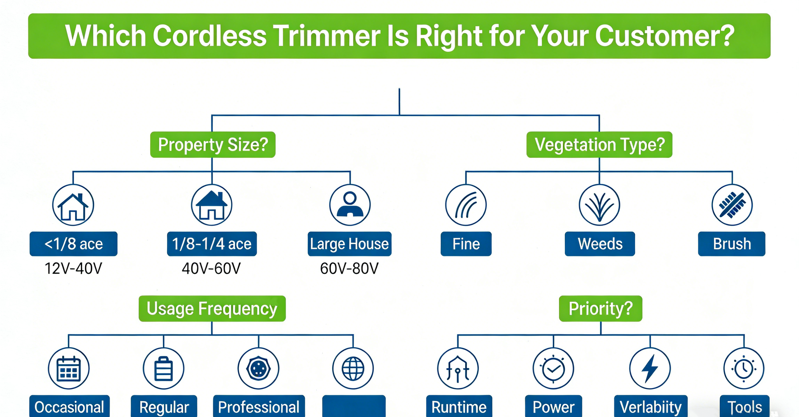 Fig.4: Decision tree infographic helping users select the right cordless trimmer based on property size, vegetation type, and usage frequency.