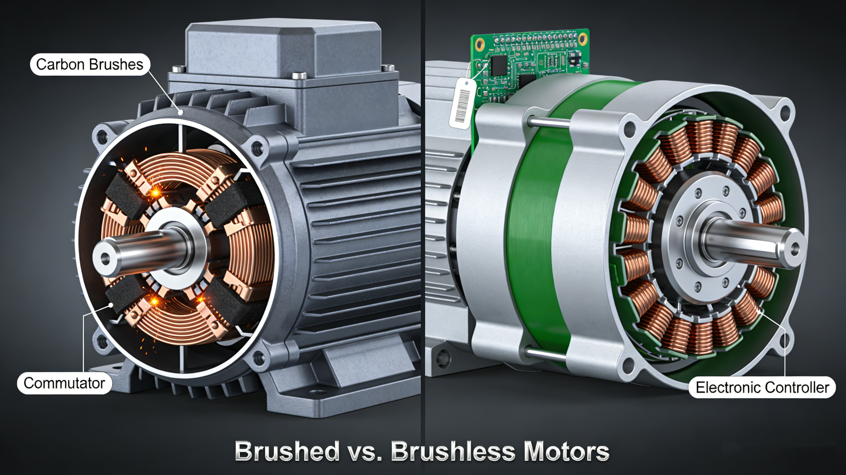Traditional brushed motors have been around for over a century. They work by using carbon brushes to deliver electricity to the spinning rotor. It's simple and inexpensive—but it's also inefficient.