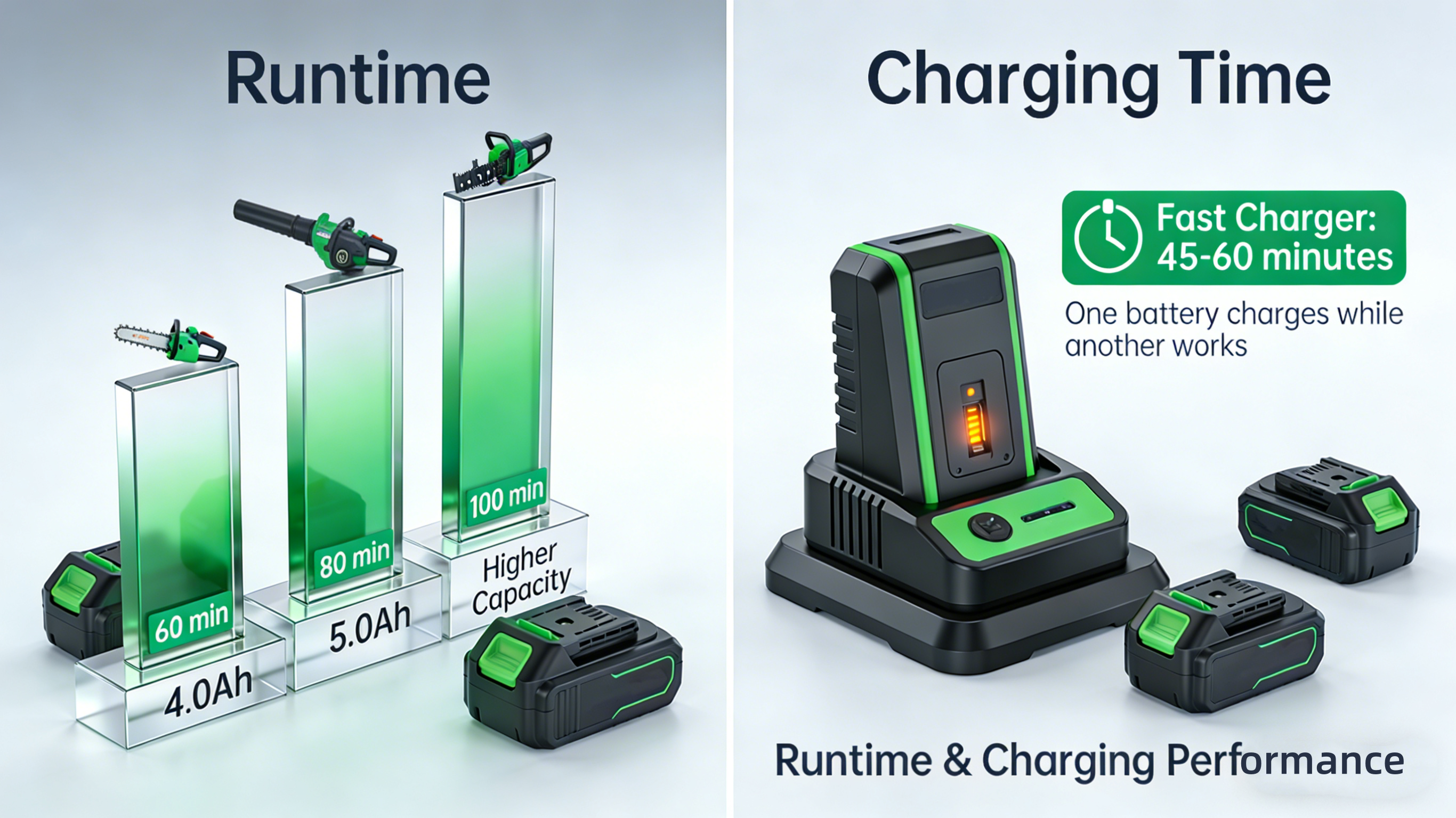 Time is money. Our fast chargers can replenish batteries in as little as 45-60 minutes depending on the model . For heavy users, this means one battery can charge while another works, enabling continuous operation throughout the day.