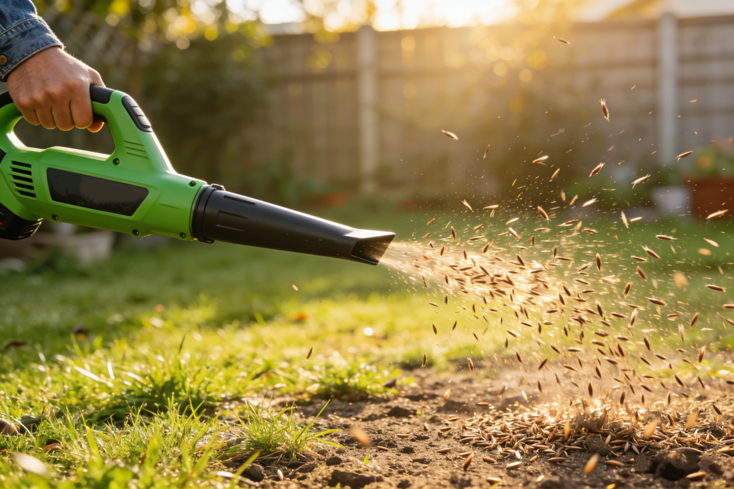 Here's a trick that's gone viral on social media: using a blower to distribute grass seed or fertilizer evenly across a lawn .