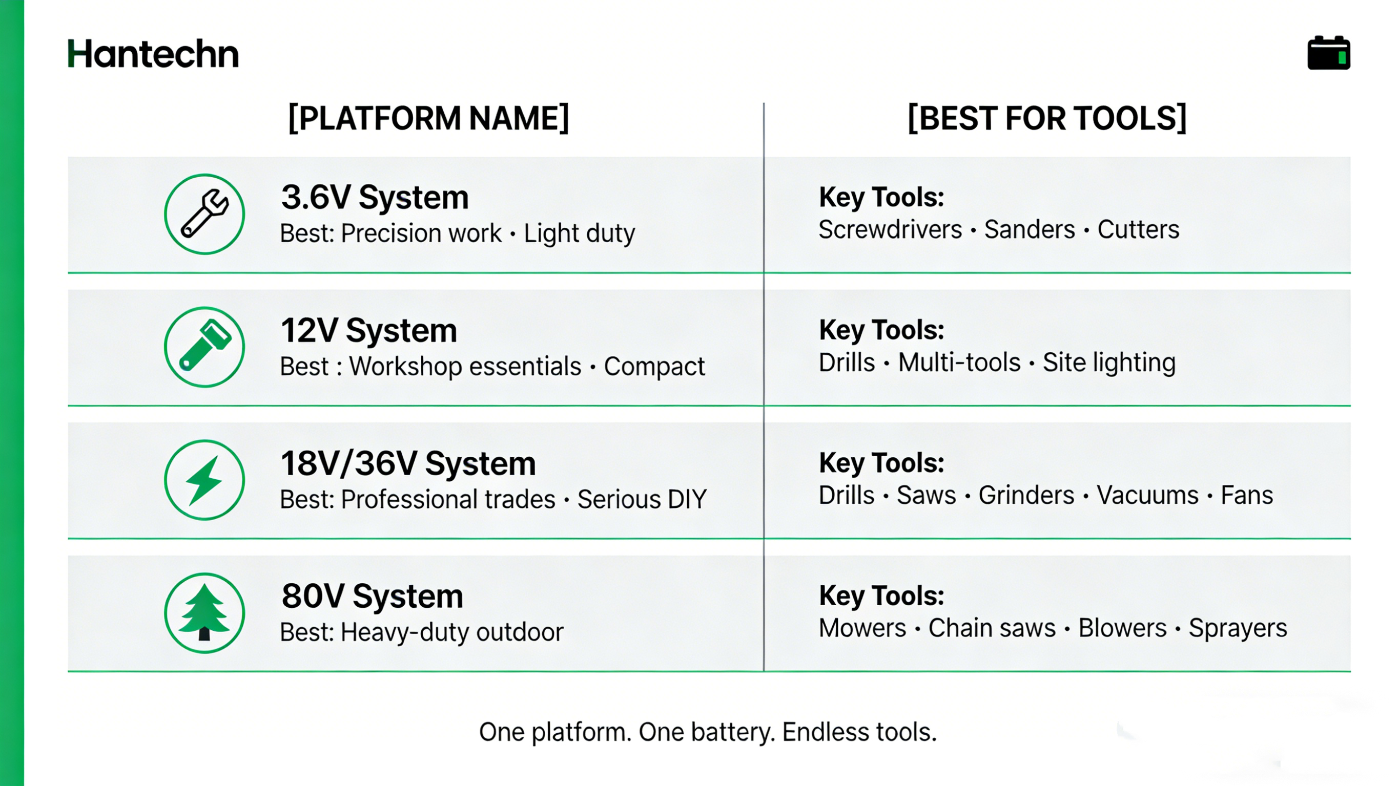 The solution is clear: unified battery platforms. And for Hantechn, with our comprehensive 3.6V to 80V cordless ecosystem, this isn't just a feature—it's our philosophy.